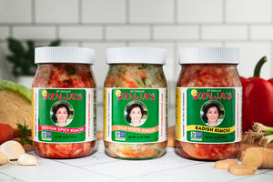 The fermentation process - which gives Sunja’s Kimchi its unique tang - creates lactic acid which preserves and enhances the vegetables. Sunja's Kimchi is made with cabbage, radishes, garlic, scallions and leeks, all of which have health benefits that are well documented in the natural food industry. The carrots, cabbage, and sweet and hot peppers are rich sources of important carotenes.