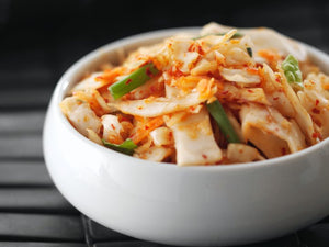 - Drain Chopped Kimchi, mix in with Barley; add some chopped Baby Kale.